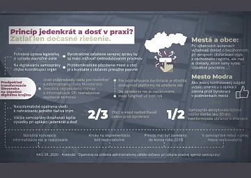 NKÚ konštatuje, že pre fungujúcu digitalizáciu samosprávy naďalej chýba metodické riadenie, usmerňovanie a koordinujúci orgán, ktorý by dokázal pracovať na implementácii cieľov e-Governmentu v podmienkach autonómnej územnej a regionálnej samosprávy. Princíp jedenkrát a dosť nie je uplatňovaný v súlade s pôvodným úmyslom. Súčasný stav možno považovať len za akési „náhradné a dočasné riešenie.”