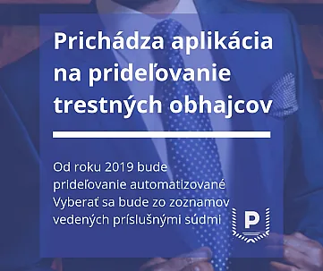 Od 1.1.2019 bude účinná novela Trestného poriadku prijatá v zákone č. 321/2018 Z. z. ktorým sa stanovila povinnosť ustanovovania obhajcov prostredníctvom programového systému schváleného Ministerstvom spravodlivosti Slovenskej republiky.